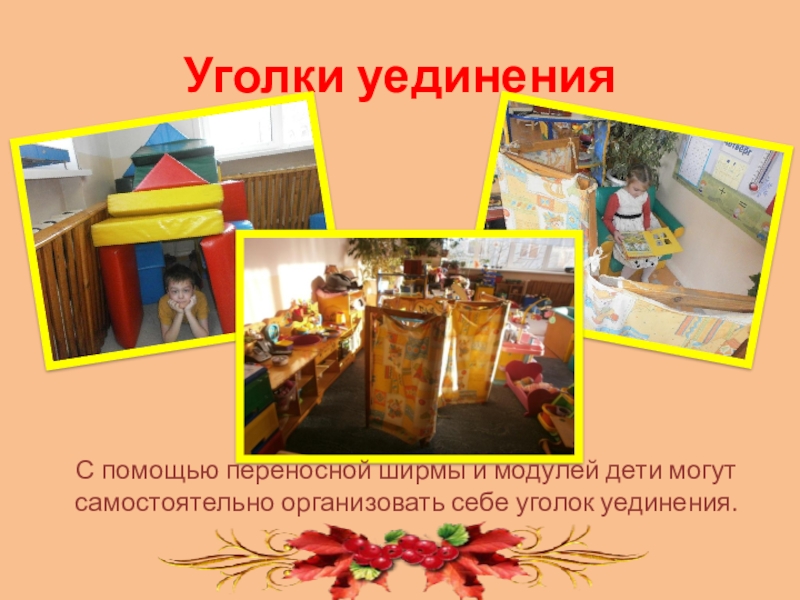 Уголки уединенияС помощью переносной ширмы и модулей дети могут самостоятельно организовать себе уголок уединения.