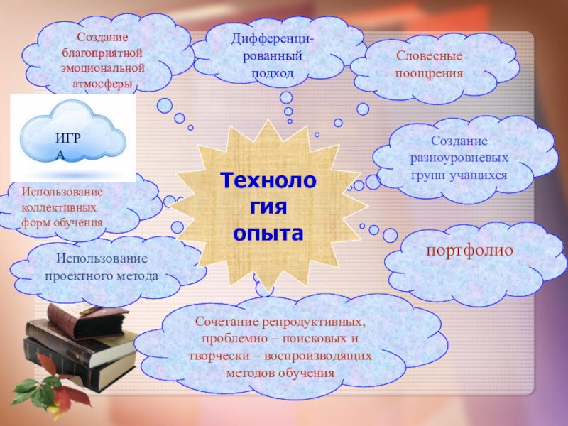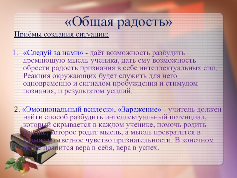 2. «Эмоциональный всплеск», «Заражение» - учитель должен найти способ разбудить интеллектуальный потенциал, который скрывается в каждом ученике, помочь родить усилие, которое родит мысль, а мысль превратится в знание и ответное чувство признательности. В конечном итоге появится вера в себя, вера в успех.
