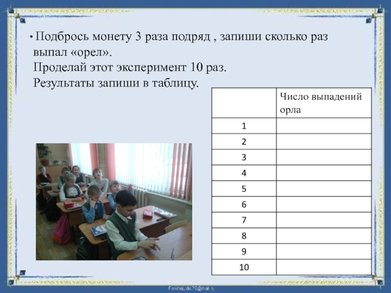 Слайд 5 Подбрось монету 3 раза подряд , запиши сколько раз