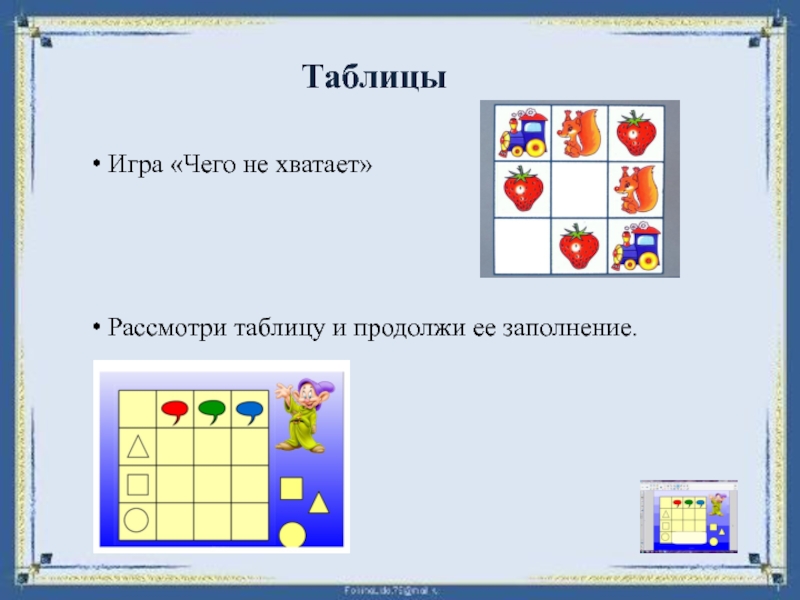 Таблицы Игра «Чего не хватает» Рассмотри таблицу и продолжи ее заполнение.