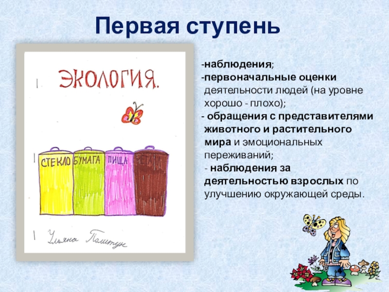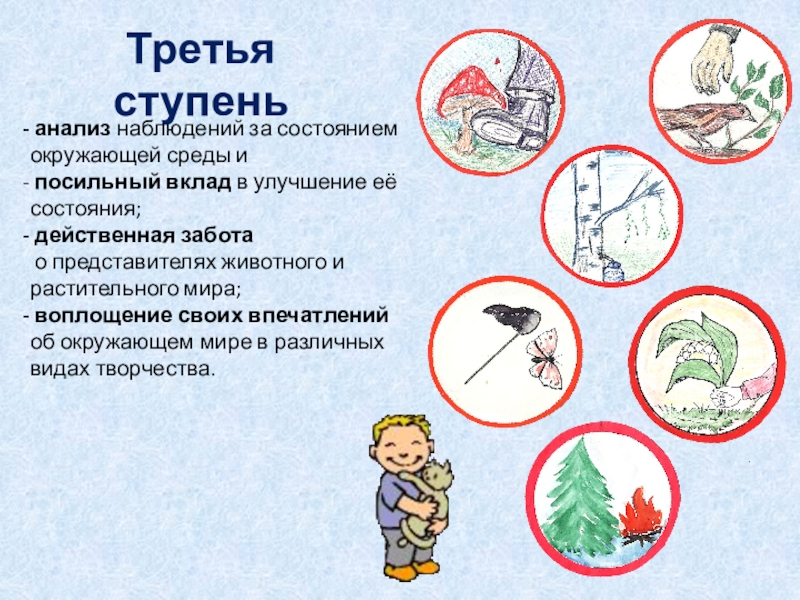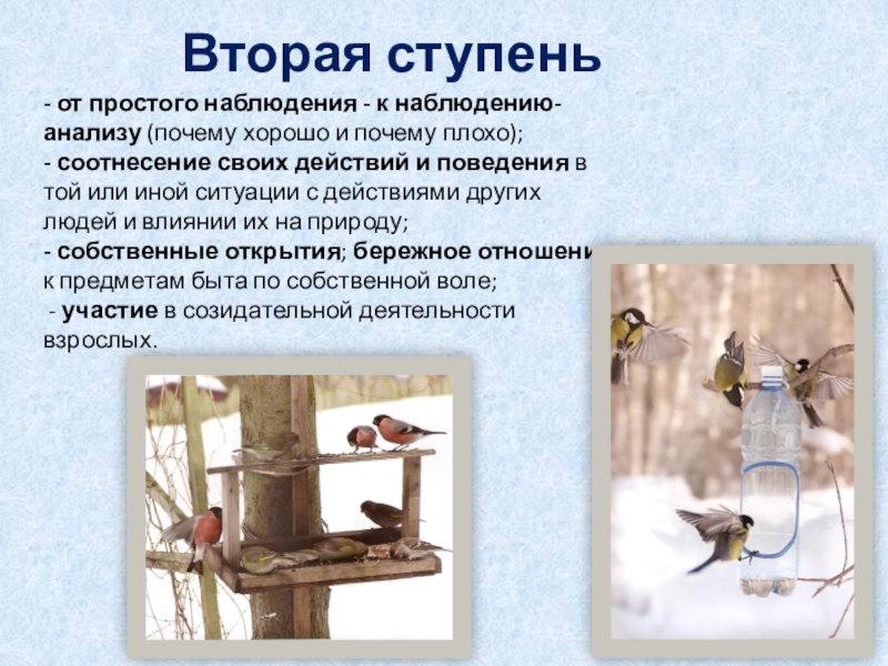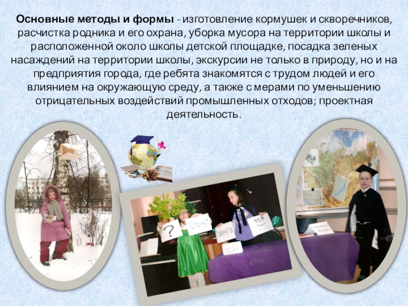 деятельность учащихся по подготовке докладов, бесед, лекций, наблюдения за животными и растениями; изготовление поделок, кормушек, скворечников, фотографирование, рисование, лепка.