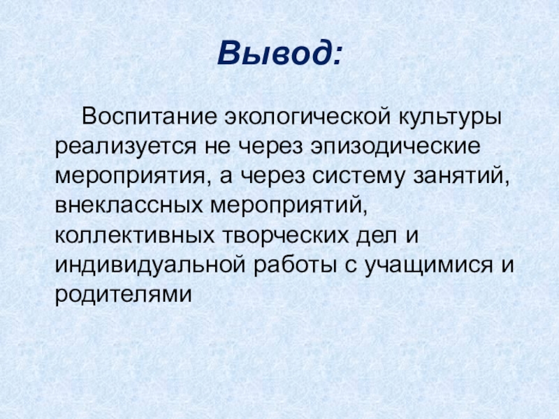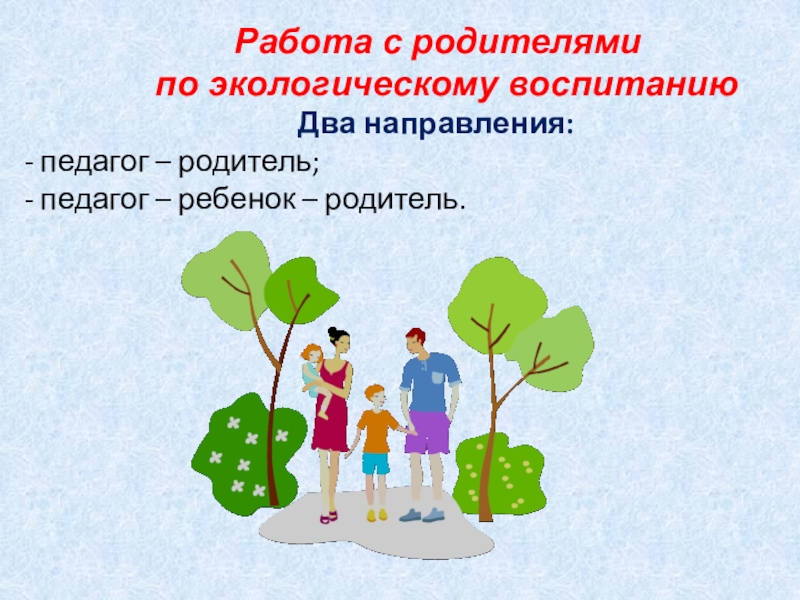 клубные, кружковые занятия юных друзей природы; факультативы по охране природы и основам экологии; кинолектории; экскурсии; туристические походы по изучению природы; экологический практикум.