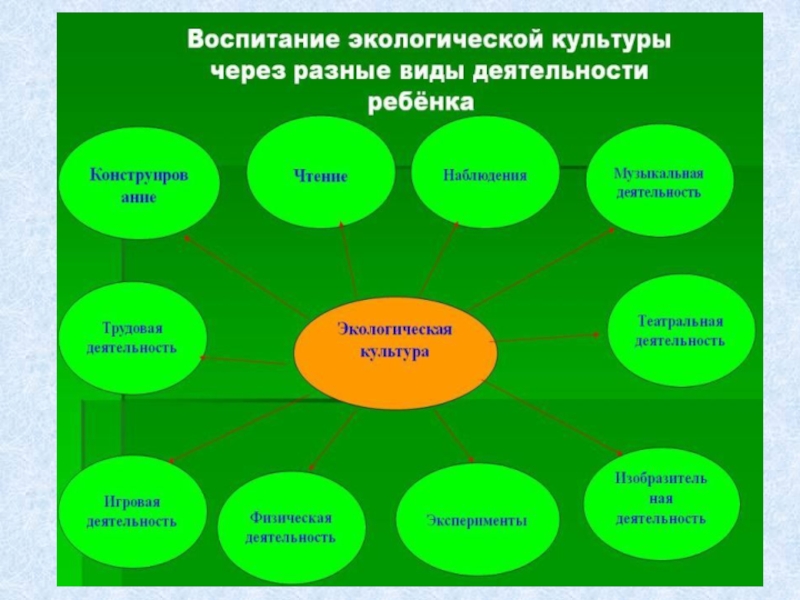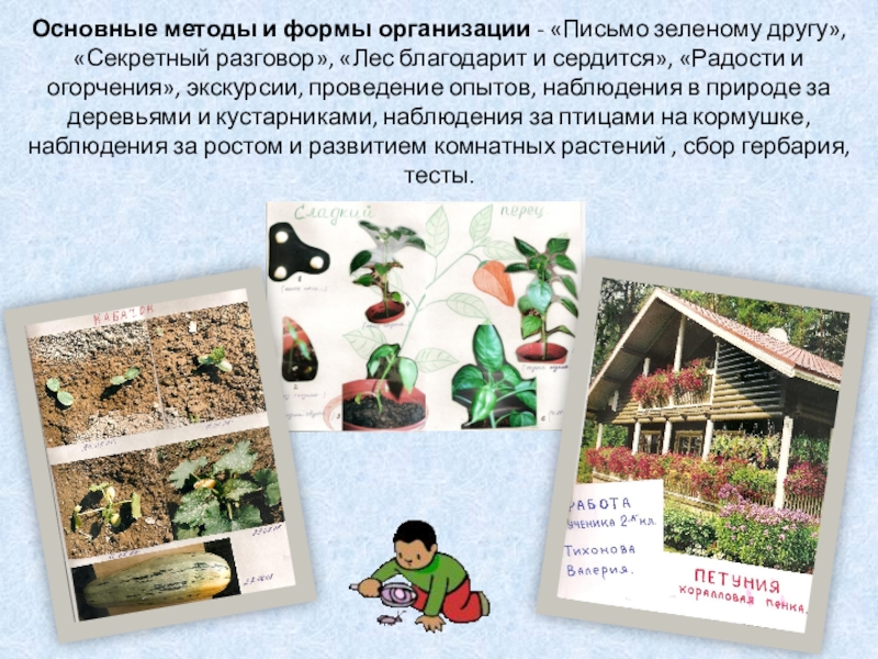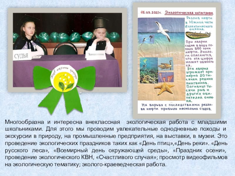 работа учащихся по благоустройству и озеленению помещений и территории школы, экологические фестивали, праздники, ролевые игры, работы на пришкольном участке.