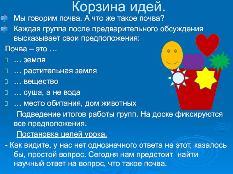 Подведение итогов работы групп. На доске фиксируются все предположения.