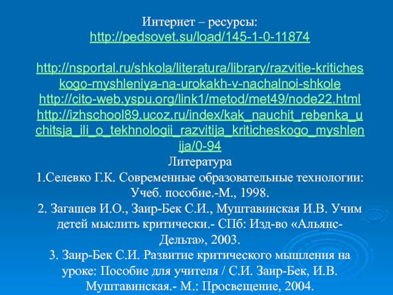 3. Заир-Бек С.И. Развитие критического мышления на уроке: Пособие для учителя / С.И. Заир-Бек, И.В.Муштавинская.- М.: Просвещение, 2004.