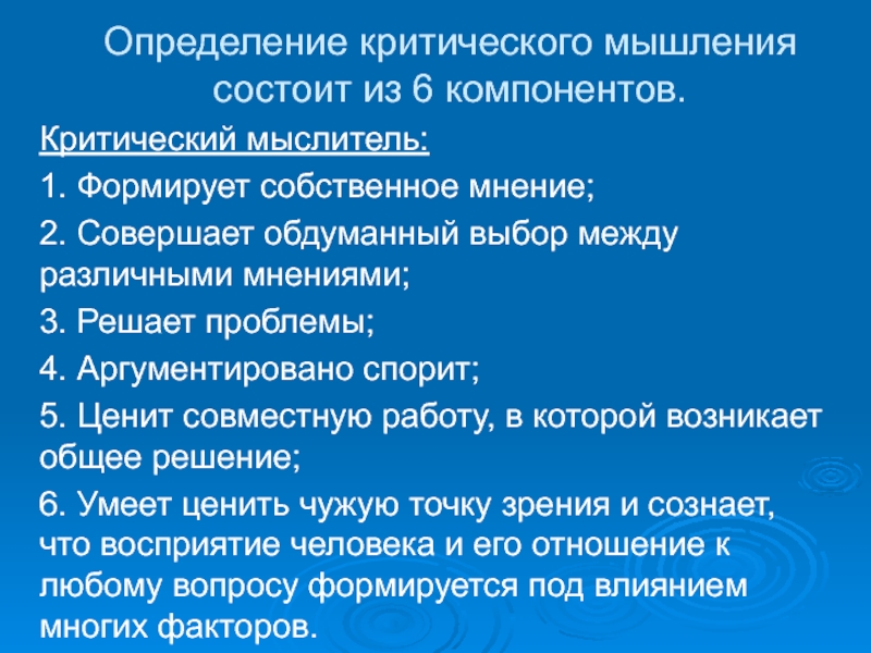 6. Умеет ценить чужую точку зрения и сознает, что восприятие человека и его отношение к любому вопросу формируется под влиянием многих факторов.