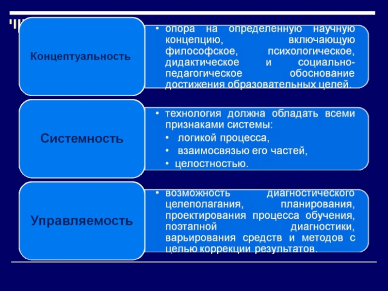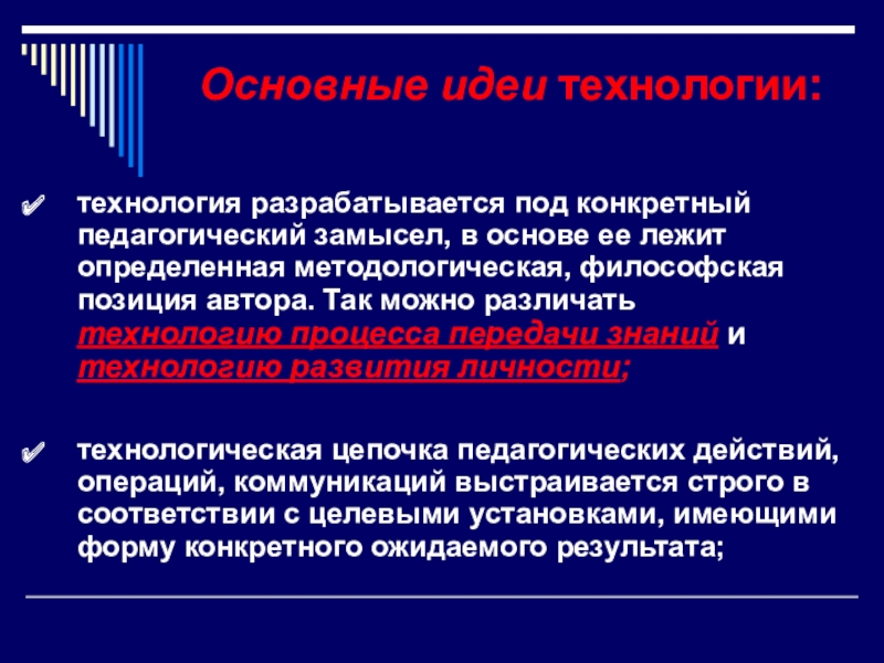 технологическая цепочка педагогических действий, операций, коммуникаций выстраивается строго в соответствии с целевыми установками, имеющими форму конкретного ожидаемого результата;