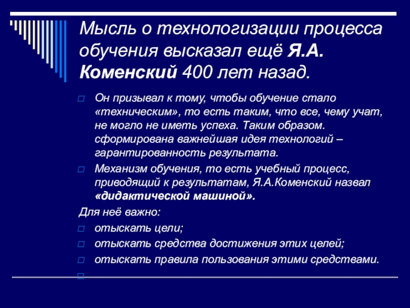 Слайд 8Мысль о технологизации процесса обучения высказал ещё Я.А.Коменский 400 лет назад.