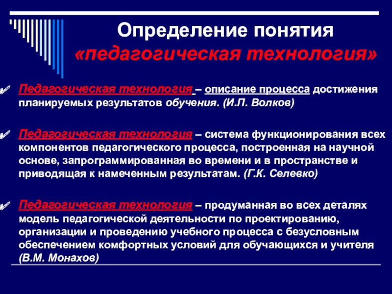 Педагогическая технология – продуманная во всех деталях модель педагогической деятельности по проектированию, организации и проведению учебного процесса с безусловным обеспечением комфортных условий для обучающихся и учителя (В.М. Монахов)
