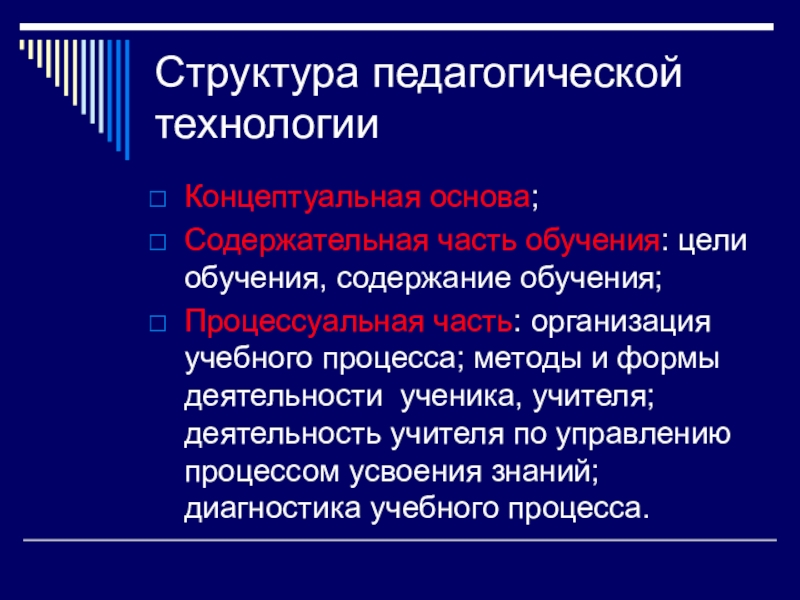 организация учебного процесса; методы и формы деятельности ученика, учителя; деятельность учителя по управлению процессом усвоения знаний; диагностика учебного процесса.