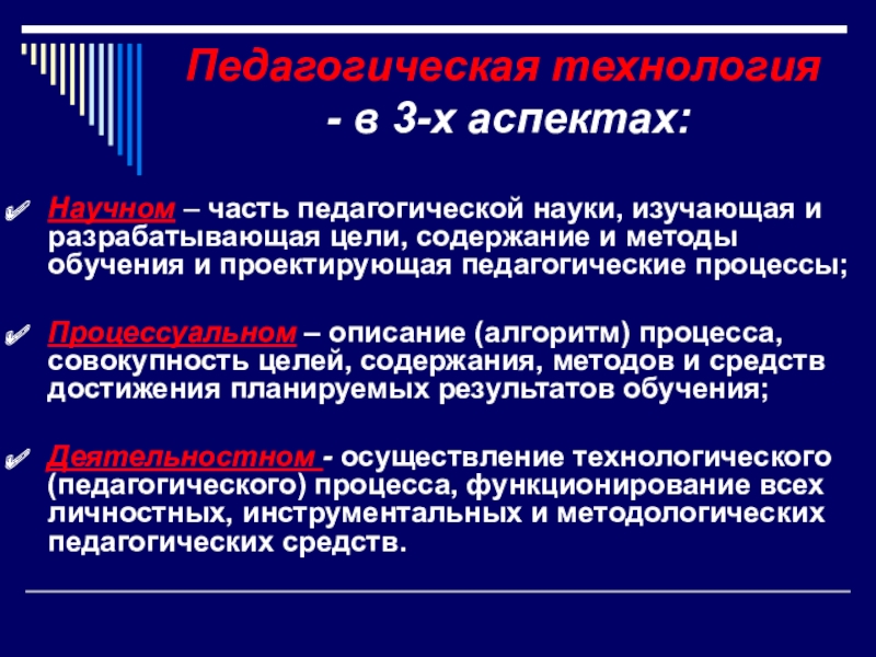 Деятельностном - осуществление технологического (педагогического) процесса, функционирование всех личностных, инструментальных и методологических педагогических средств.
