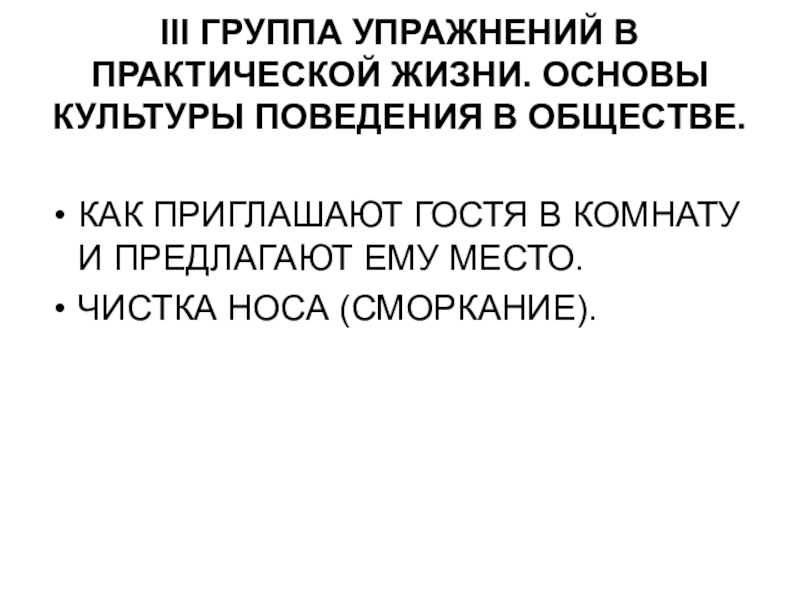 Слайд 93III ГРУППА УПРАЖНЕНИЙ В ПРАКТИЧЕСКОЙ ЖИЗНИ. ОСНОВЫ КУЛЬТУРЫ ПОВЕДЕНИЯ В ОБЩЕСТВЕ.