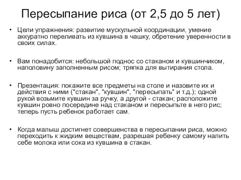 Слайд 67Пересыпание риса (от 2,5 до 5 лет)