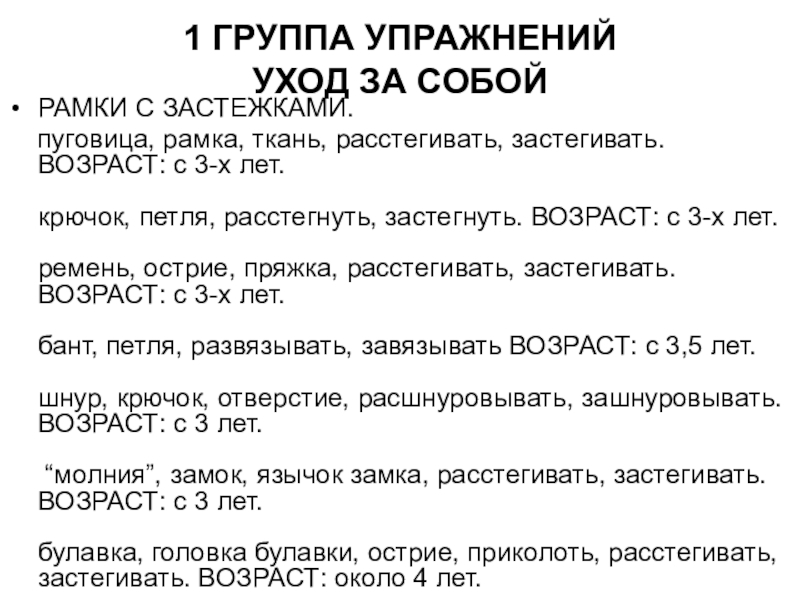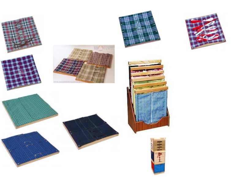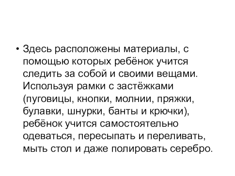 и своими вещами. Используя рамки с застёжками (пуговицы, кнопки, молнии, пряжки, булавки, шнурки, банты и крючки), ребёнок учится самостоятельно одеваться, пересыпать и переливать, мыть стол и даже полировать серебро.