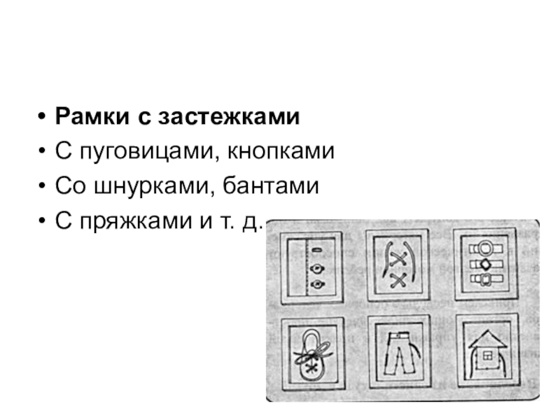 обучения навыкам самообслуживания - со шнурками, пуговицами, кнопками, молниями. Это замечательное пособие, вы можете купить такие рамки или сделать самостоятельно. Для этого на пяльцы или деревянную рамку надо натянуть курточку с застежкой или пуговицами.