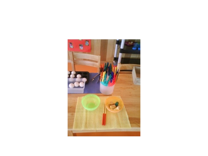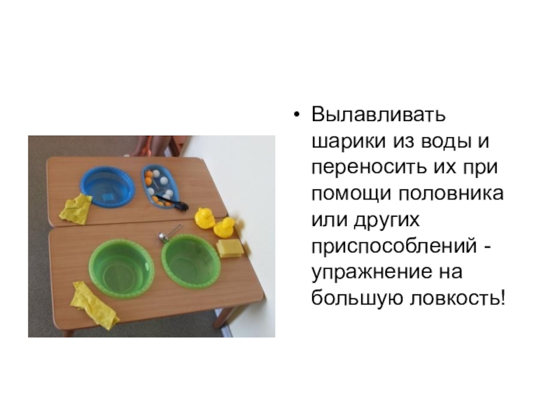 ношением предметов. Здесь же упражнения с пипетками, пинцетами, прищепками, нанизыванием бус, сортировкой мелких предметов.