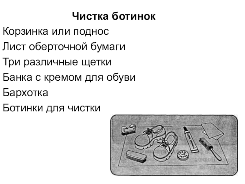 Презентация: расстелите газету на полу; щеткой удалите грязь с ботинок; держа левой рукой ботинок, правой нанесите крем, повторите то же самое с другим ботинком; дайте высохнуть крему на ботинках, в это время закройте крышку на креме; тряпкой отполируйте ботинки до блеска;