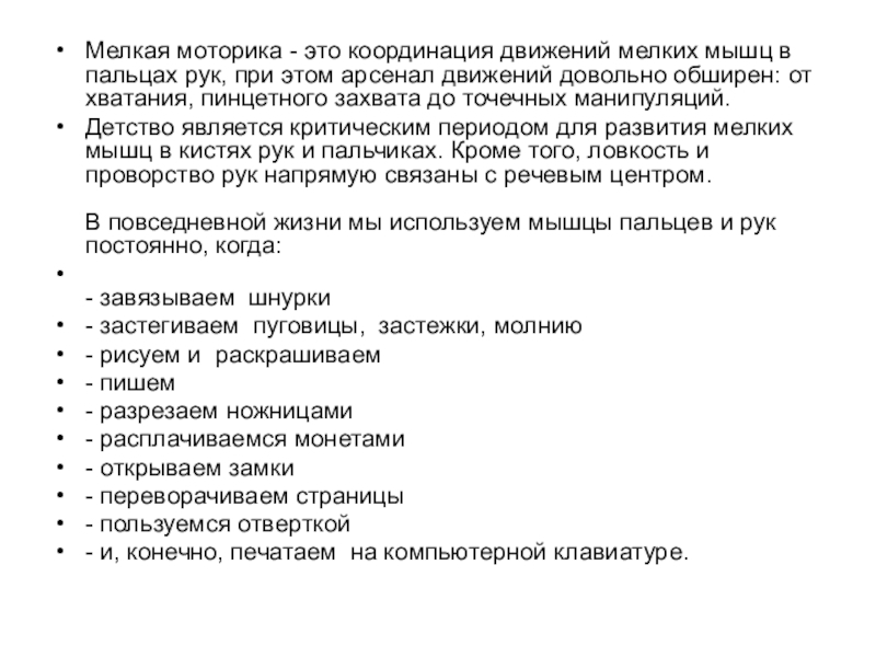 Детство является критическим периодом для развития мелких мышц в кистях рук и пальчиках. Кроме того, ловкость и проворство рук напрямую связаны с речевым центром.