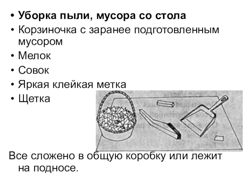 Слайд 26Уборка пыли, мусора со стола