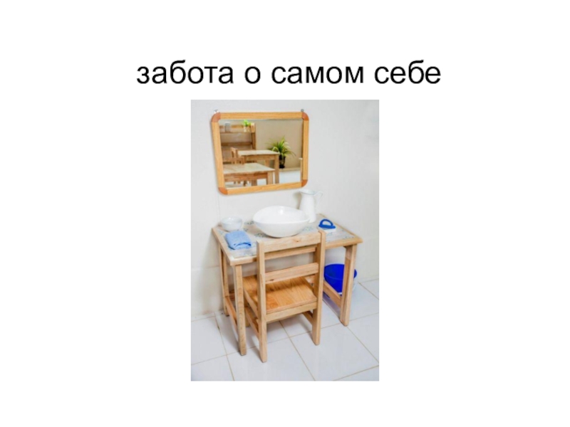 умывальником с кувшином и тазом, учит детей умываться: мыть руки, чистить ногти, мыть лицо и шею, хорошенько промывать глаза и уши, чистить зубы и полоскать рот. Мы обращаем их внимание на те части тела, которые они омывают, и на различные средства содержать их в опрятности: чистая вода – для глаз, мыло и вода – для рук, щетка – для зубов и т. п. Больших детей мы просим помогать маленьким, приучая, однако, малышей также самостоятельно справляться”.