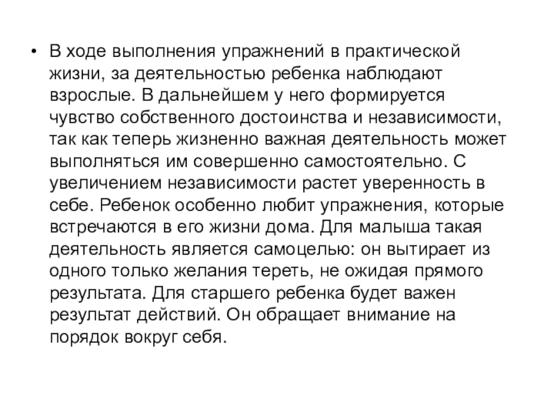 взрослые. В дальнейшем у него формируется чувство собственного достоинства и независимости, так как теперь жизненно важная деятельность может выполняться им совершенно самостоятельно. С увеличением независимости растет уверенность в себе. Ребенок особенно любит упражнения, которые встречаются в его жизни дома. Для малыша такая деятельность является самоцелью: он вытирает из одного только желания тереть, не ожидая прямого результата. Для старшего ребенка будет важен результат действий. Он обращает внимание на порядок вокруг себя.