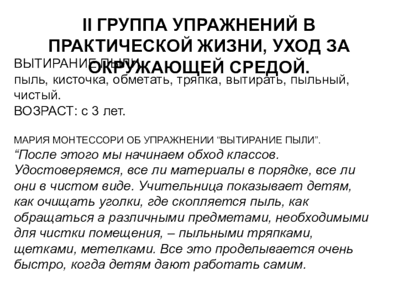 МАРИЯ МОНТЕССОРИ ОБ УПРАЖНЕНИИ “ВЫТИРАНИЕ ПЫЛИ”.