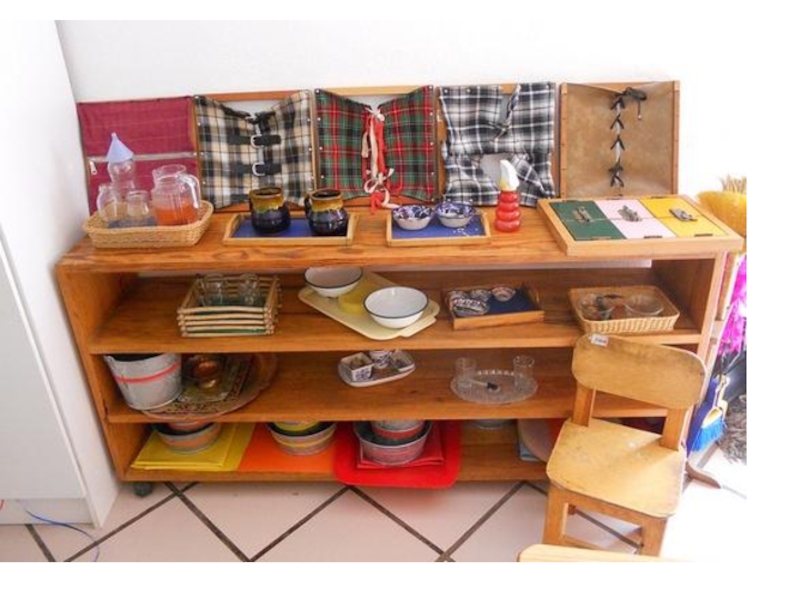 упражнения в практической жизни, часть которых произошли из повседневных домашних дел. Для того чтобы дети получали большую радость и удовлетворение от собственной деятельности, предусмотрены такие упражнения как: переливание воды, пересыпание руками и ложкой, подметание пола, мытье посуды, завязывание бантов и так далее.
