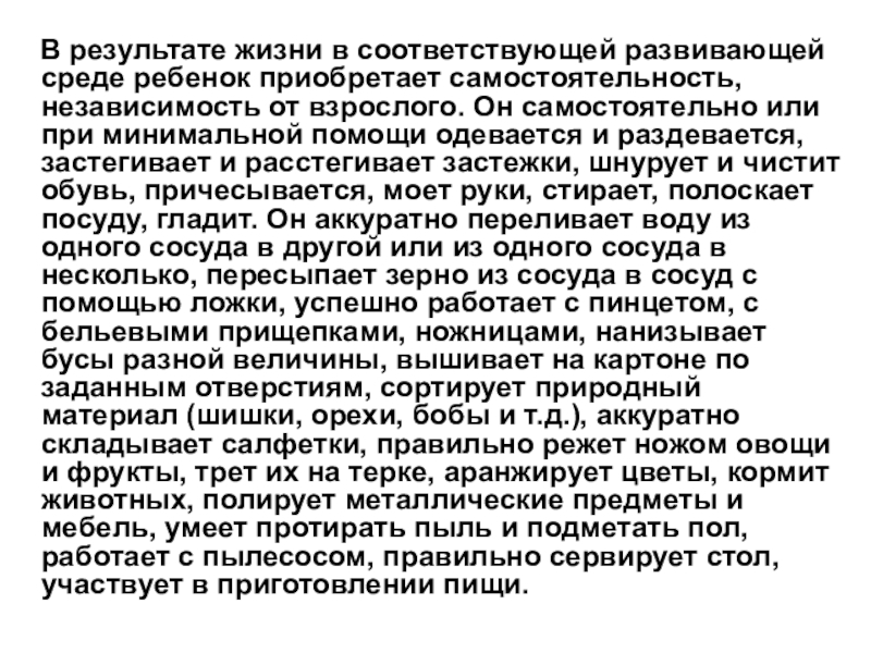 ребенок приобретает самостоятельность, независимость от взрослого. Он самостоятельно или при минимальной помощи одевается и раздевается, застегивает и расстегивает застежки, шнурует и чистит обувь, причесывается, моет руки, стирает, полоскает посуду, гладит. Он аккуратно переливает воду из одного сосуда в другой или из одного сосуда в несколько, пересыпает зерно из сосуда в сосуд с помощью ложки, успешно работает с пинцетом, с бельевыми прищепками, ножницами, нанизывает бусы разной величины, вышивает на картоне по заданным отверстиям, сортирует природный материал (шишки, орехи, бобы и т.д.), аккуратно складывает салфетки, правильно режет ножом овощи и фрукты, трет их на терке, аранжирует цветы, кормит животных, полирует металлические предметы и мебель, умеет протирать пыль и подметать пол, работает с пылесосом, правильно сервирует стол, участвует в приготовлении пищи.