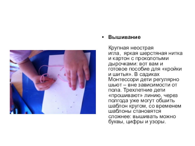 вот вам и готовое пособие для «кройки и шитья». В cадиках Монтессори дети регулярно шьют – вне зависимости от пола. Трехлетние дети «прошивают» линию, через полгода уже могут обшить шаблон кругом, со временем шаблоны становятся сложнее: вышивать можно буквы, цифры и узоры.