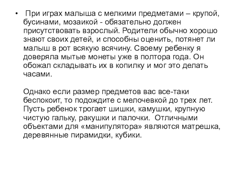 Слайд 84 При играх малыша с мелкими предметами – крупой, бусинами, мозаикой - обязательно