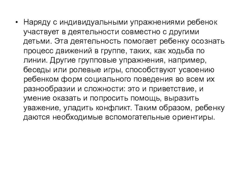 Слайд 5Наряду с индивидуальными упражнениями ребенок участвует в деятельности совместно с другими