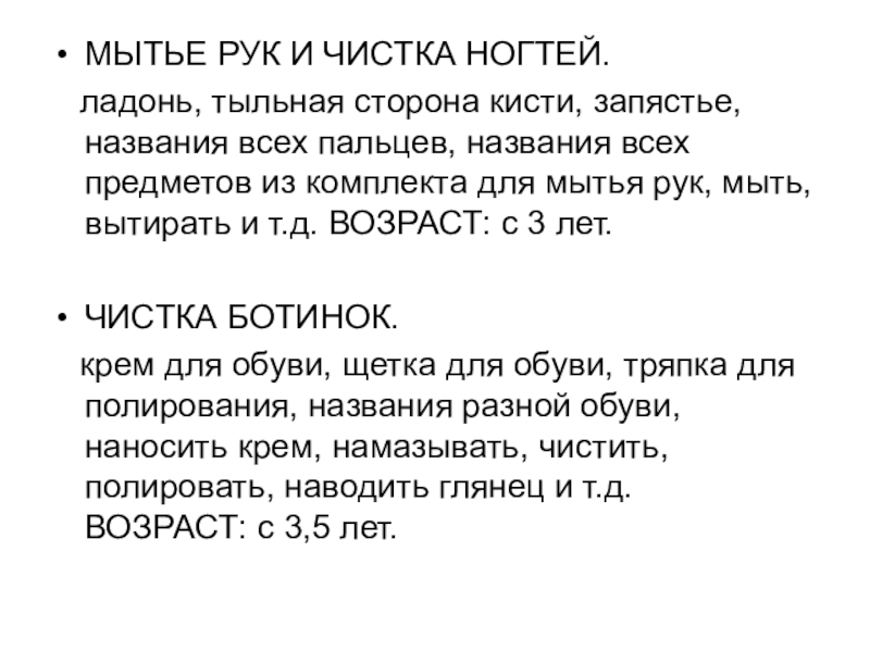 запястье, названия всех пальцев, названия всех предметов из комплекта для мытья рук, мыть, вытирать и т.д. ВОЗРАСТ: с 3 лет.