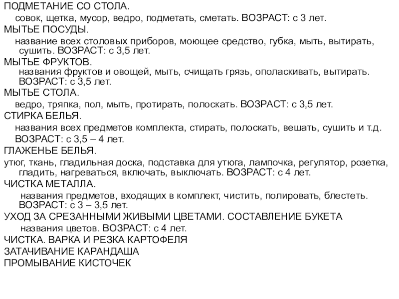 название всех столовых приборов, моющее средство, губка, мыть, вытирать, сушить. ВОЗРАСТ: с 3,5 лет.