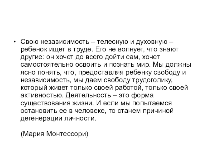 Свою независимость – телесную и духовную – ребенок ищет в труде.