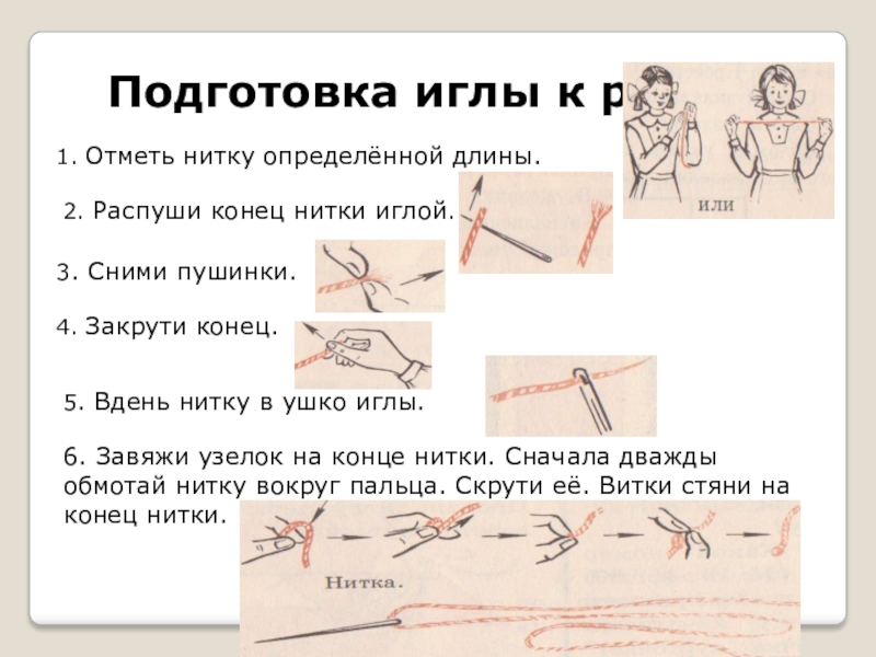 6. Завяжи узелок на конце нитки. Сначала дважды обмотай нитку вокруг пальца. Скрути её. Витки стяни на конец нитки.