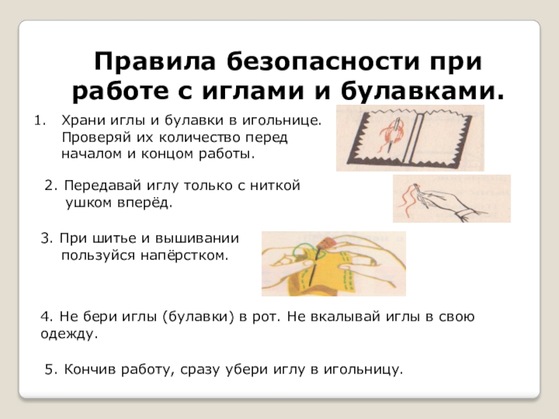 4. Не бери иглы (булавки) в рот. Не вкалывай иглы в свою одежду.