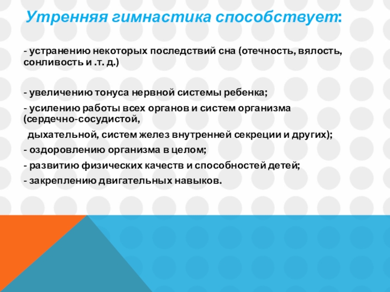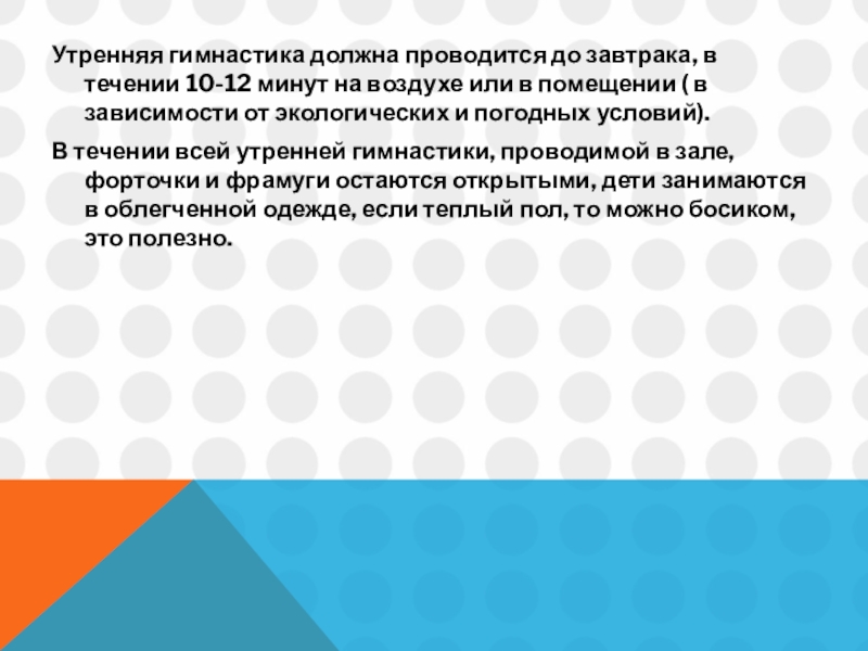 Слайд 3Утренняя гимнастика должна проводится до завтрака, в течении 10-12 минут на