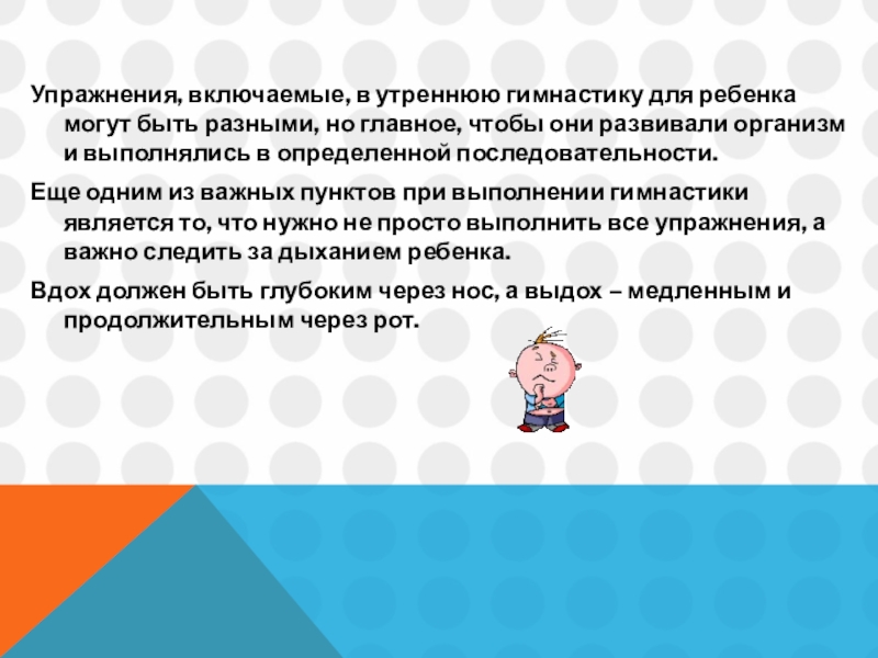 Еще одним из важных пунктов при выполнении гимнастики является то, что нужно не просто выполнить все упражнения, а важно следить за дыханием ребенка.
