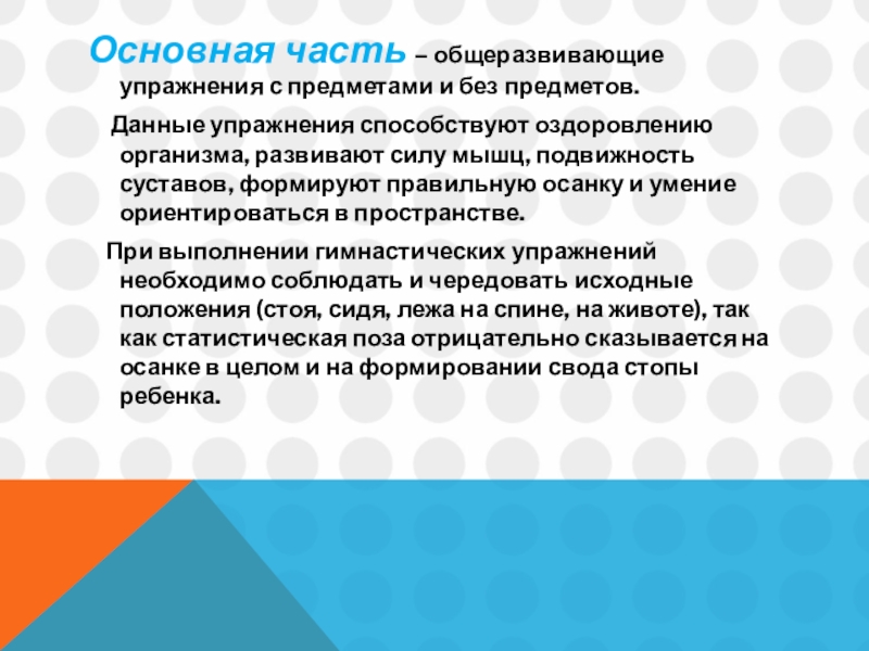 Слайд 11Основная часть – общеразвивающие упражнения с предметами и без предметов.