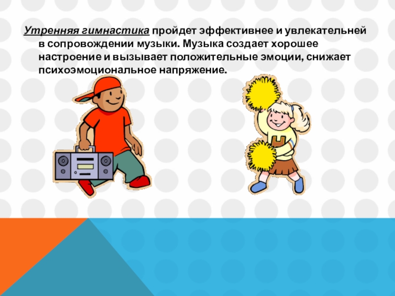 Утренняя гимнастика пройдет эффективнее и увлекательней в сопровождении музыки. Музыка создает
