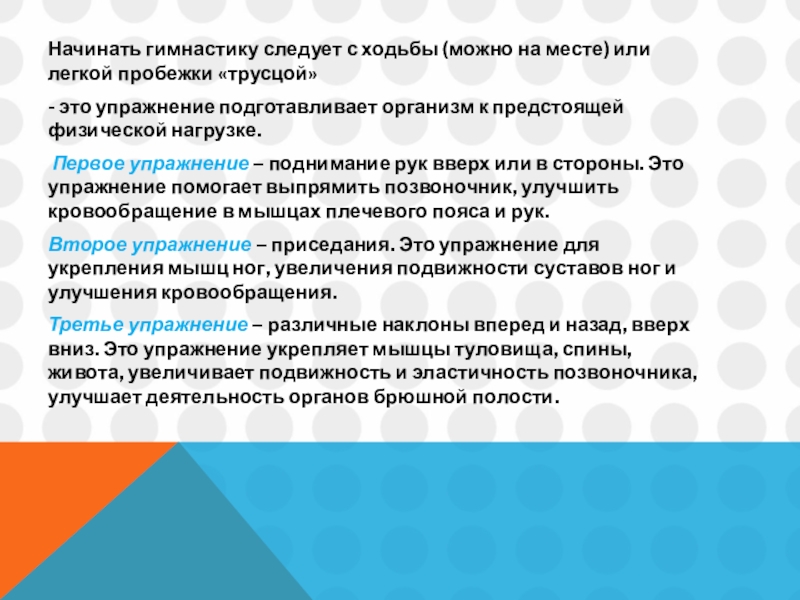 Слайд 8Начинать гимнастику следует с ходьбы (можно на месте) или легкой пробежки