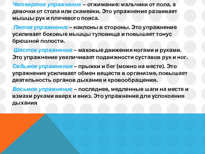 Слайд 9Четвертое упражнение – отжимание: мальчики от пола, а девочки от стола