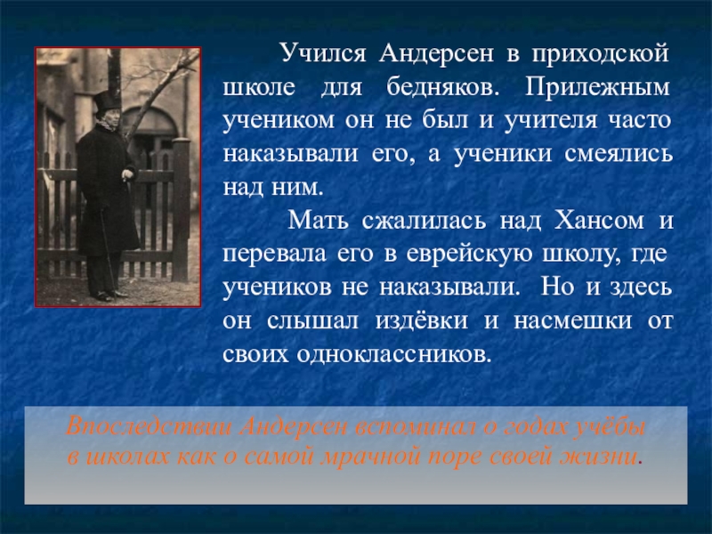 Впоследствии Андерсен вспоминал о годах учёбы