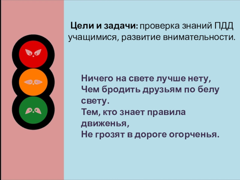 Слайд 2Цели и задачи: проверка знаний ПДД учащимися, развитие внимательности.