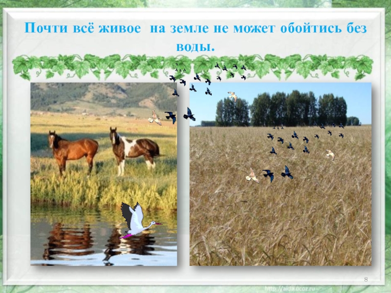 Слайд 8Почти всё живое на земле не может обойтись без воды.