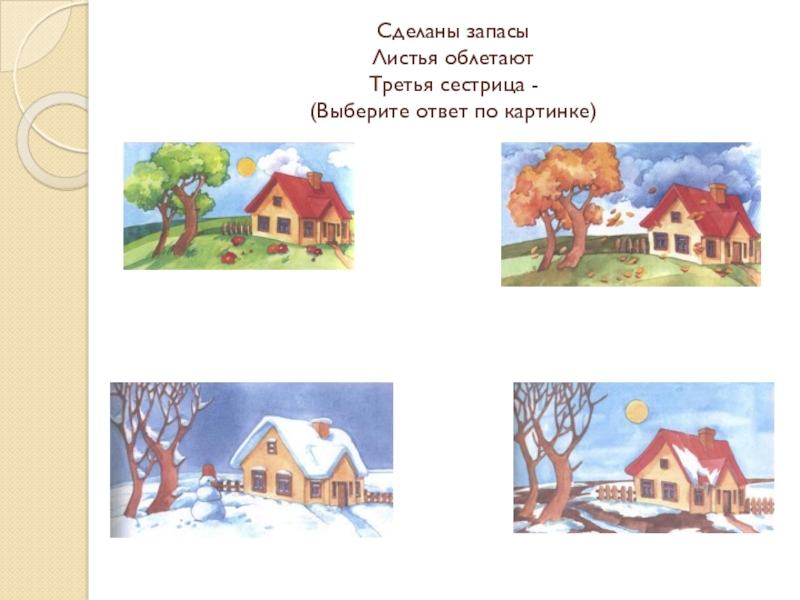 Слайд 4Сделаны запасы Листья облетают Третья сестрица - (Выберите ответ по картинке)