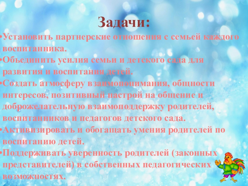 Задачи:Установить партнерские отношения с семьей каждого воспитанника.Объединить усилия семьи и детского сада для развития и воспитания детей.Создать