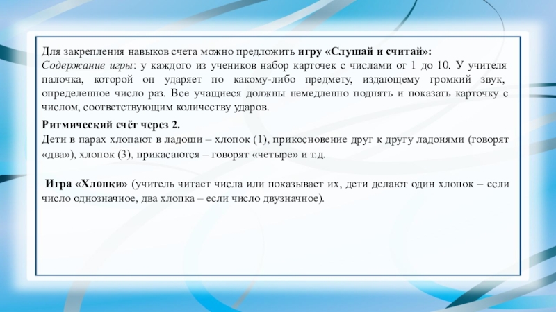 Слайд 27Для закрепления навыков счета можно предложить игру «Слушай и считай»: