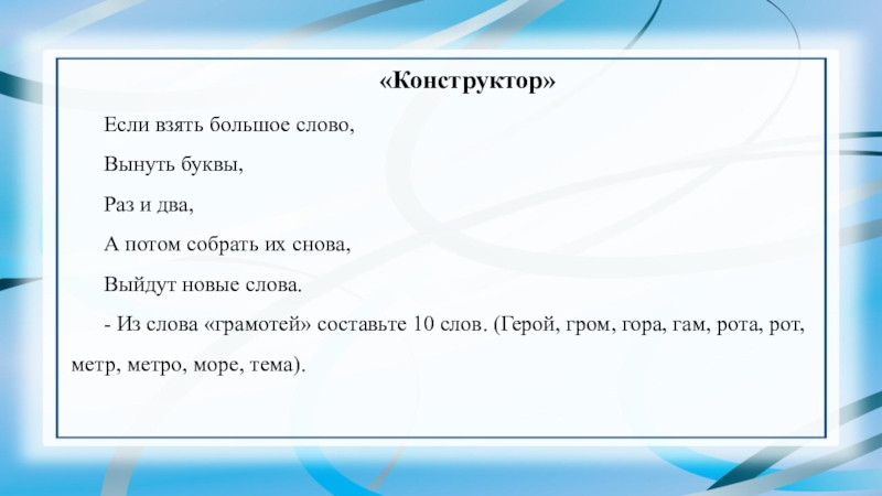 - Из слова «грамотей» составьте 10 слов. (Герой, гром, гора, гам, рота, рот, метр, метро, море, тема).