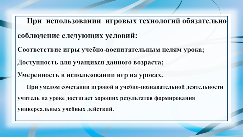 Слайд 17При использовании игровых технологий обязательно соблюдение следующих условий: